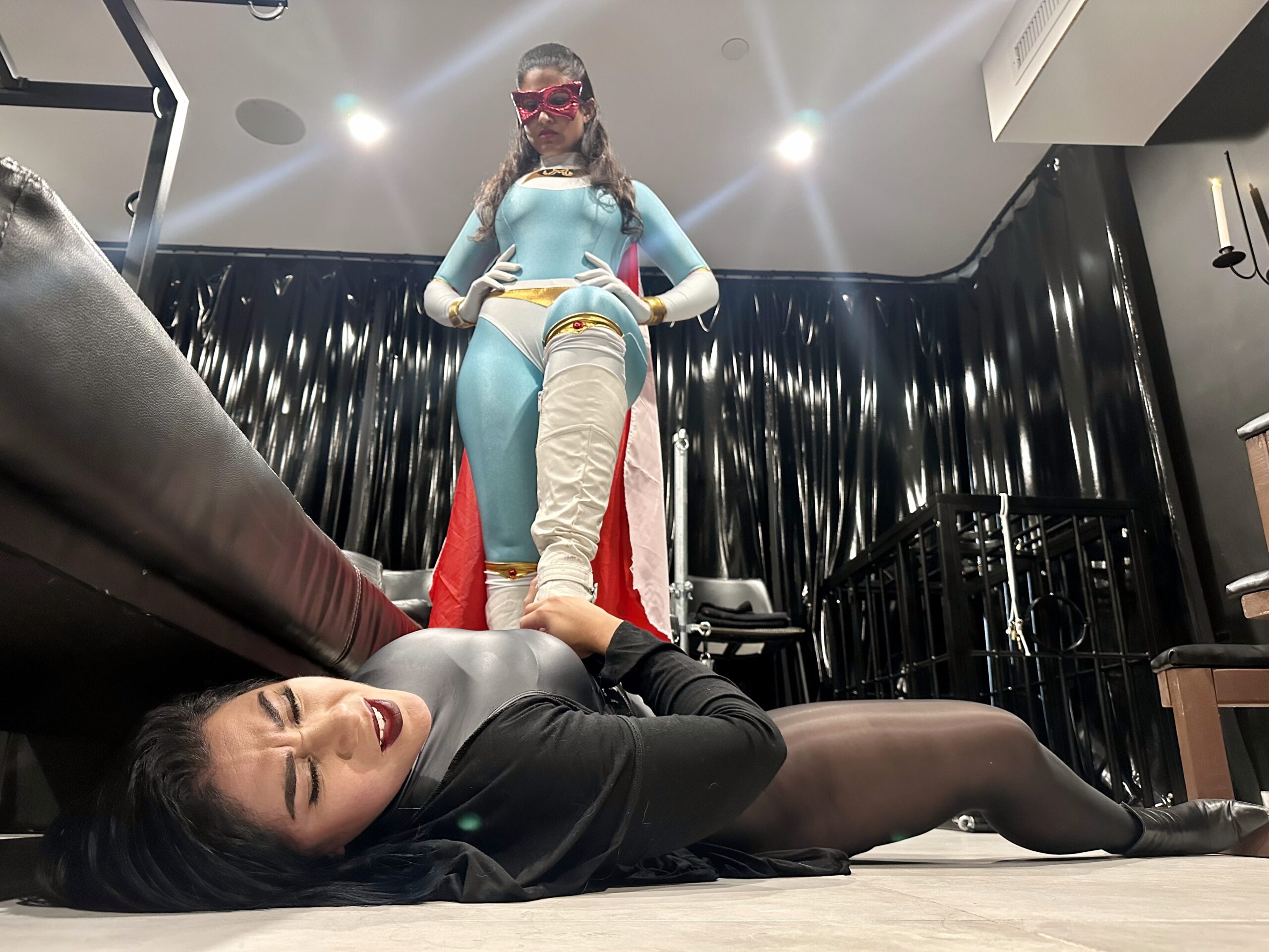 In this story: Miss Mighty takes a crack at taking on the villainess mastermind in her secret lair and she is dominating Veda until the tides turn. Veda manages to defeat and capture the heroine and proceeds to torture, seduce and humiliate Mighty Miss.