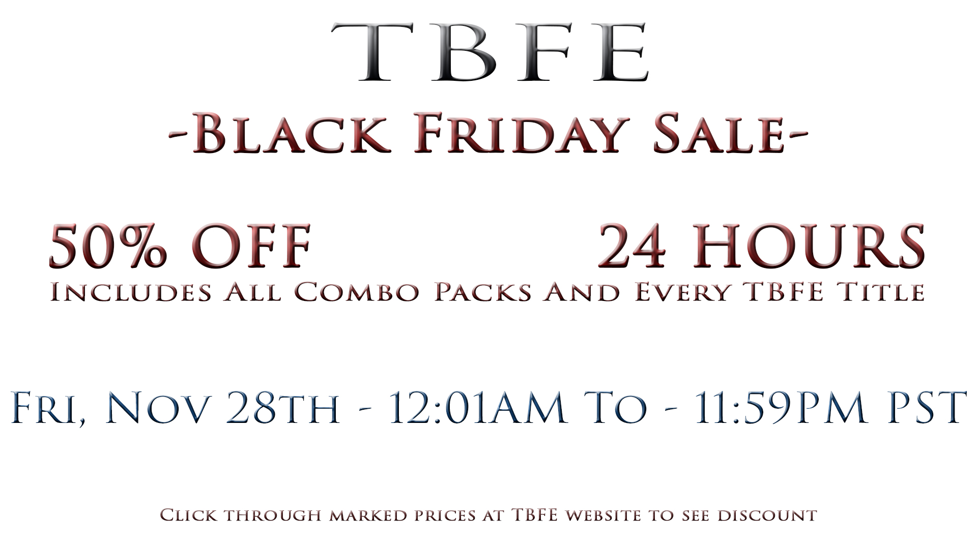 Surprise Black Friday Flash Sale! All titles will be 50% off for 24 hours, no exceptions. This includes combo packs for deeper savings. Click through marked prices at the TBFE website, and the sale price will be reflected when added to the cart!